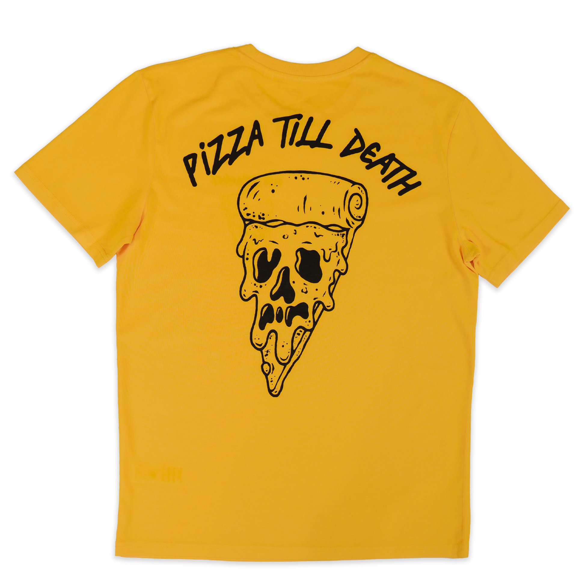 Back: “Pizza Till Death” lettering and design in black
